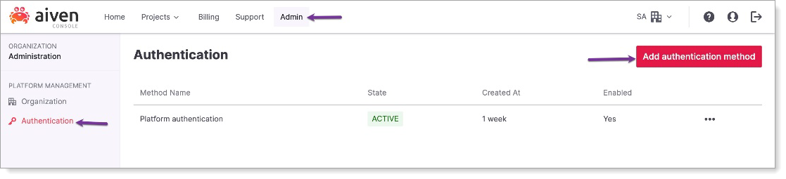 At the top, click Admin and in the left navigation, select Authentication. Then, click Add Add authentication method.