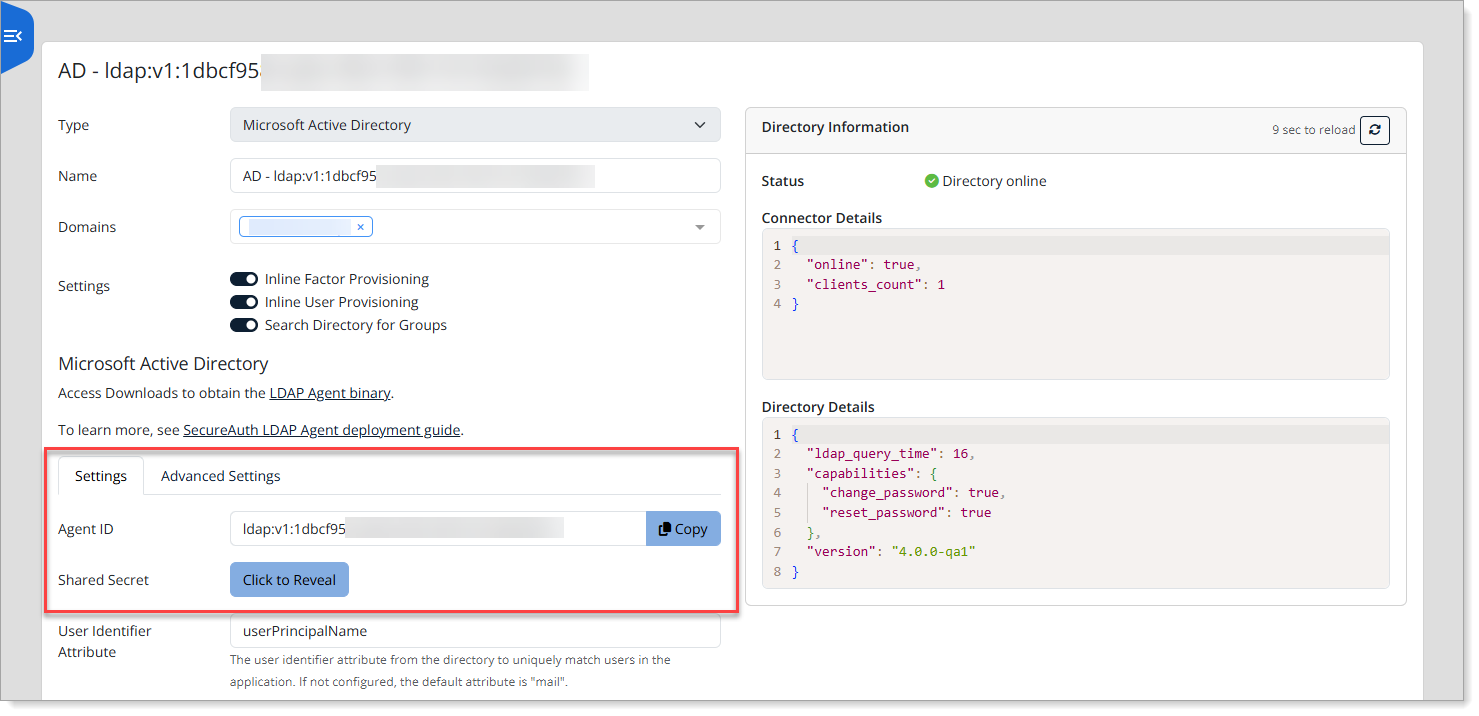 Add or edit a Microsoft Active directory and copy the Agent ID and Shared Secret.