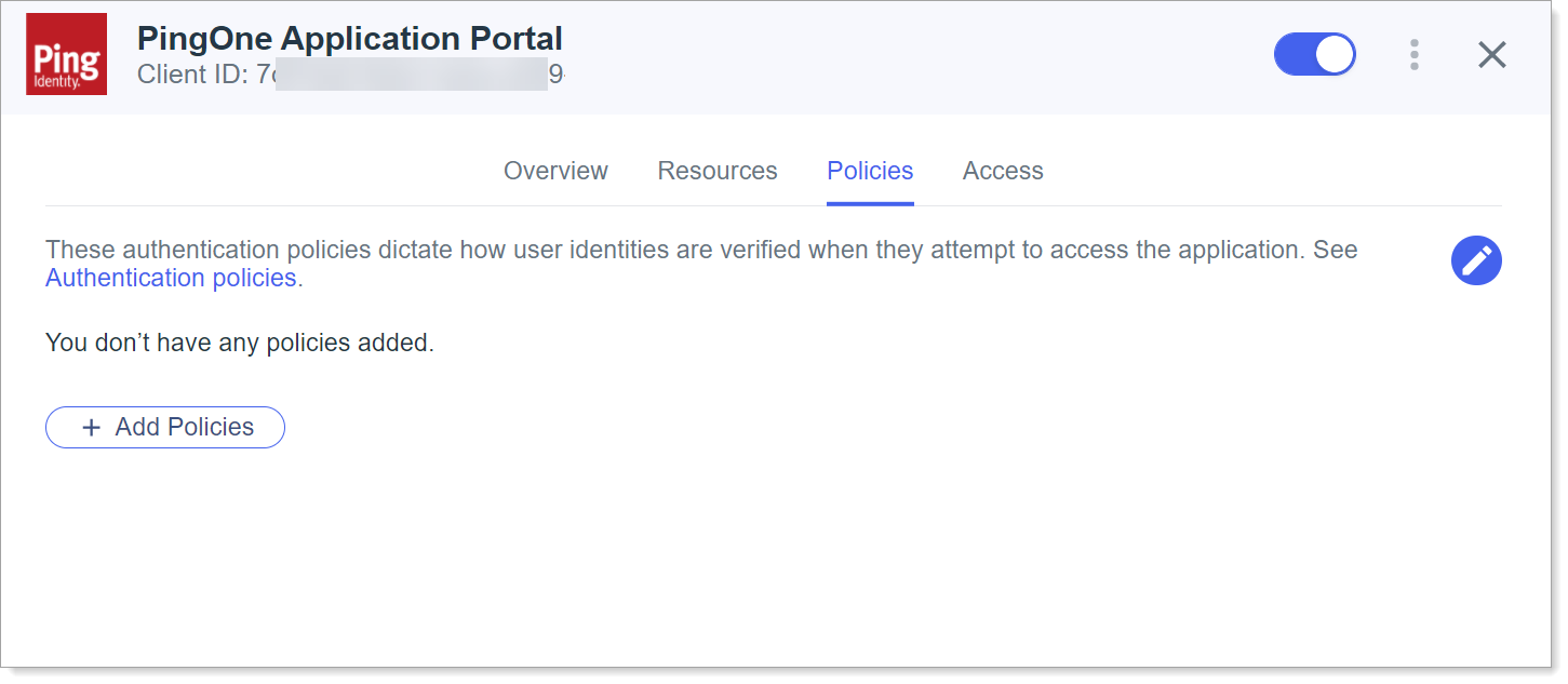 On the PingOne Application Portal page, select the Policies tab then click Add Policies.